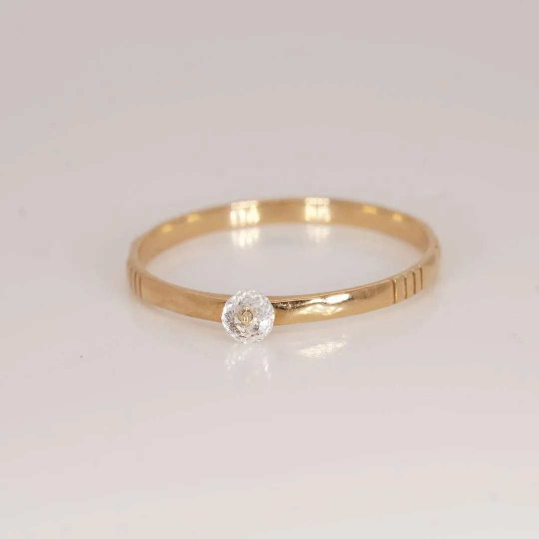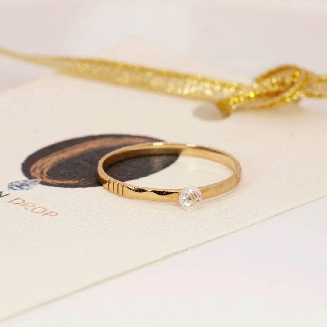 A slender golden band cradles a tiny white bead at its centre – a sparkling bubble of champagne, frozen in gold. Bliss is the joy that lifts your heart, the warm thrill of a first sip, the laughter that bubbles up without reason. Each glance at this little gem is a celebration of life’s bright, fleeting moments – a private sparkle of happiness, a tiny cheer for yourself, a reminder that joy can be captured and worn.