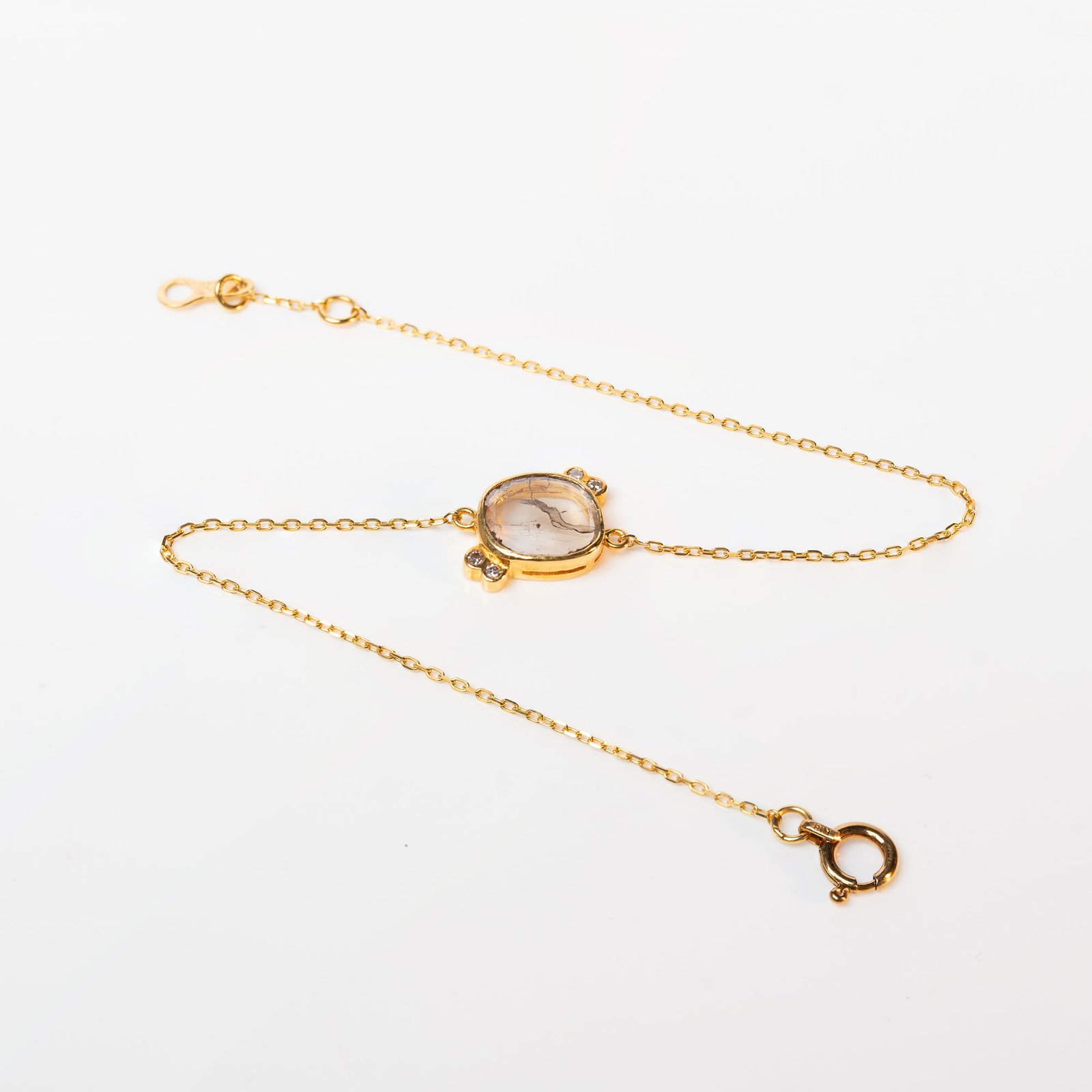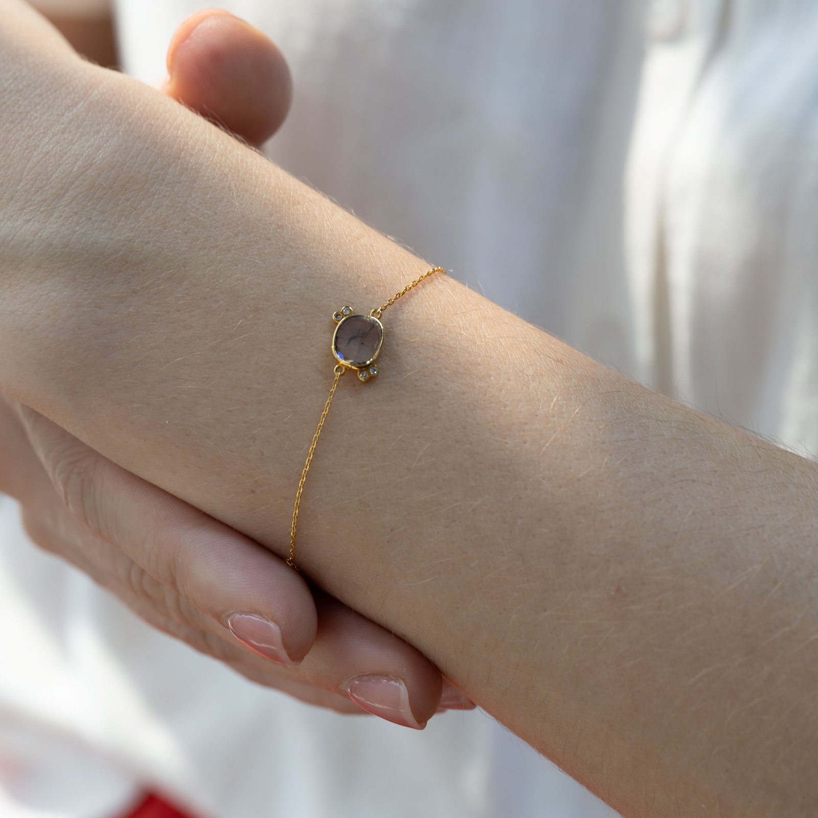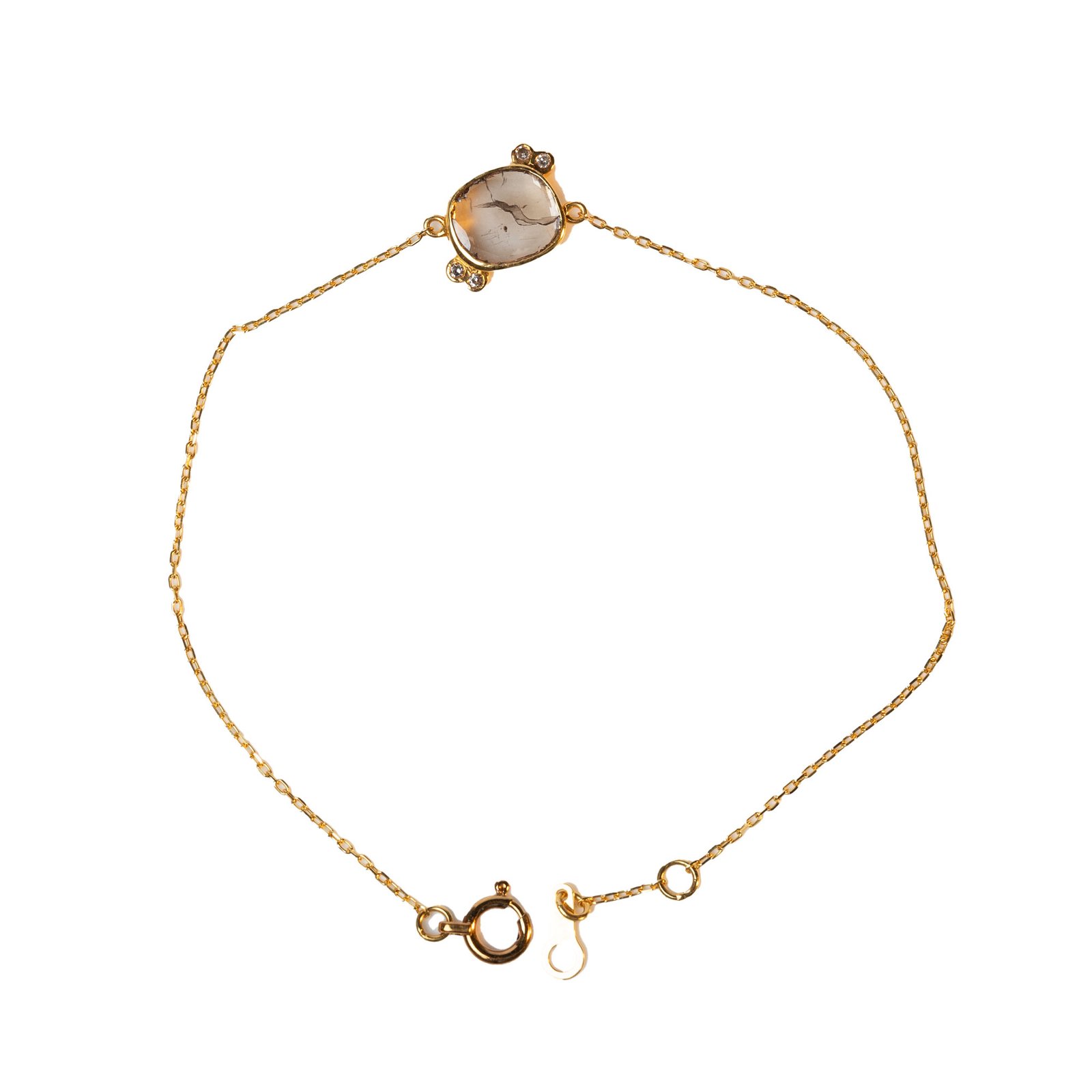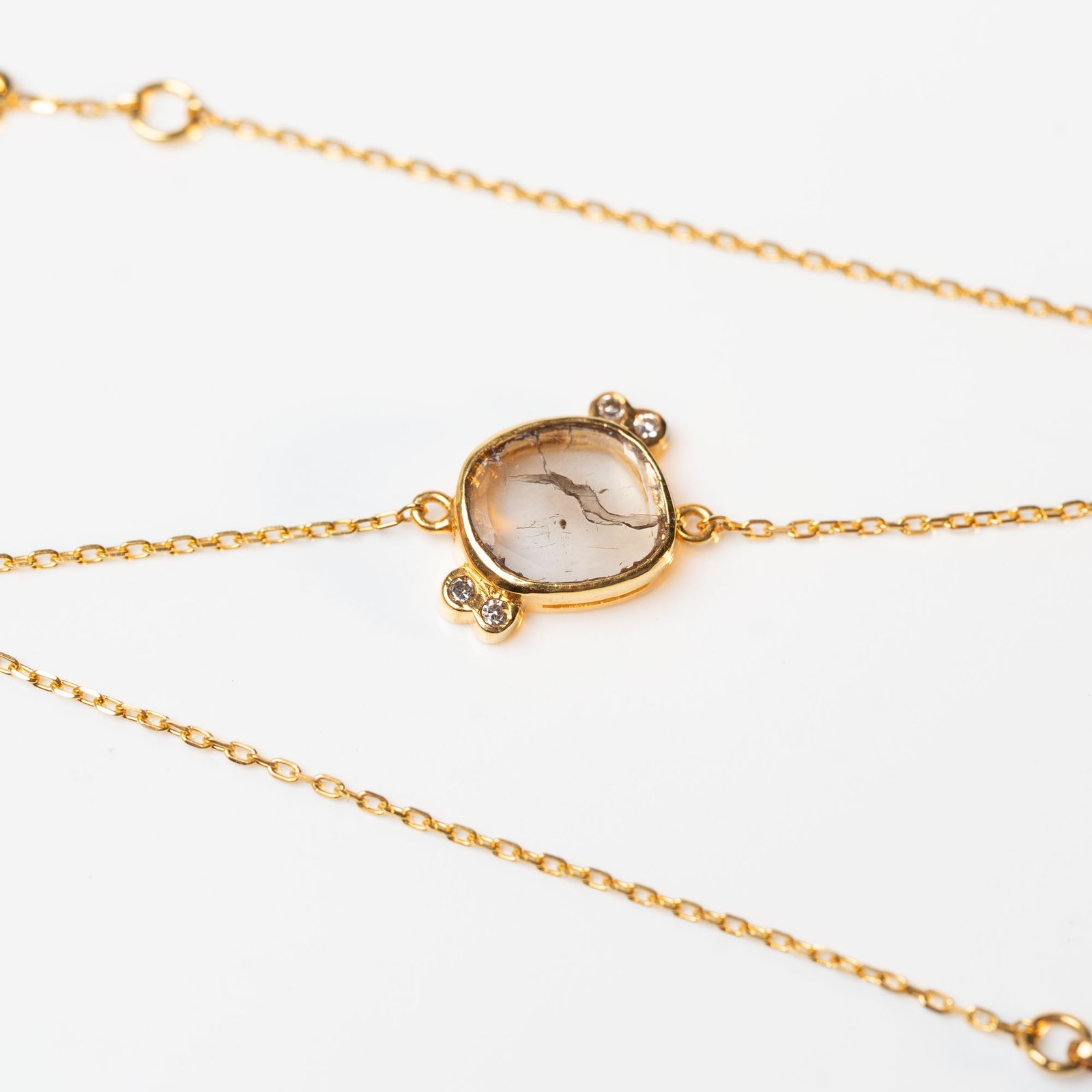 A quiet sense of grounding, something steady and close. At the center, a slice diamond holds natural lines formed deep within the earth, long before it was ever seen. They move across the surface without pattern, like traces left behind rather than made. Around it, four small white diamonds sit lightly, framing the center without taking from it. Nothing is refined or hidden. Each element remains as it is, brought together with intention. Worn close, it feels simple and real —