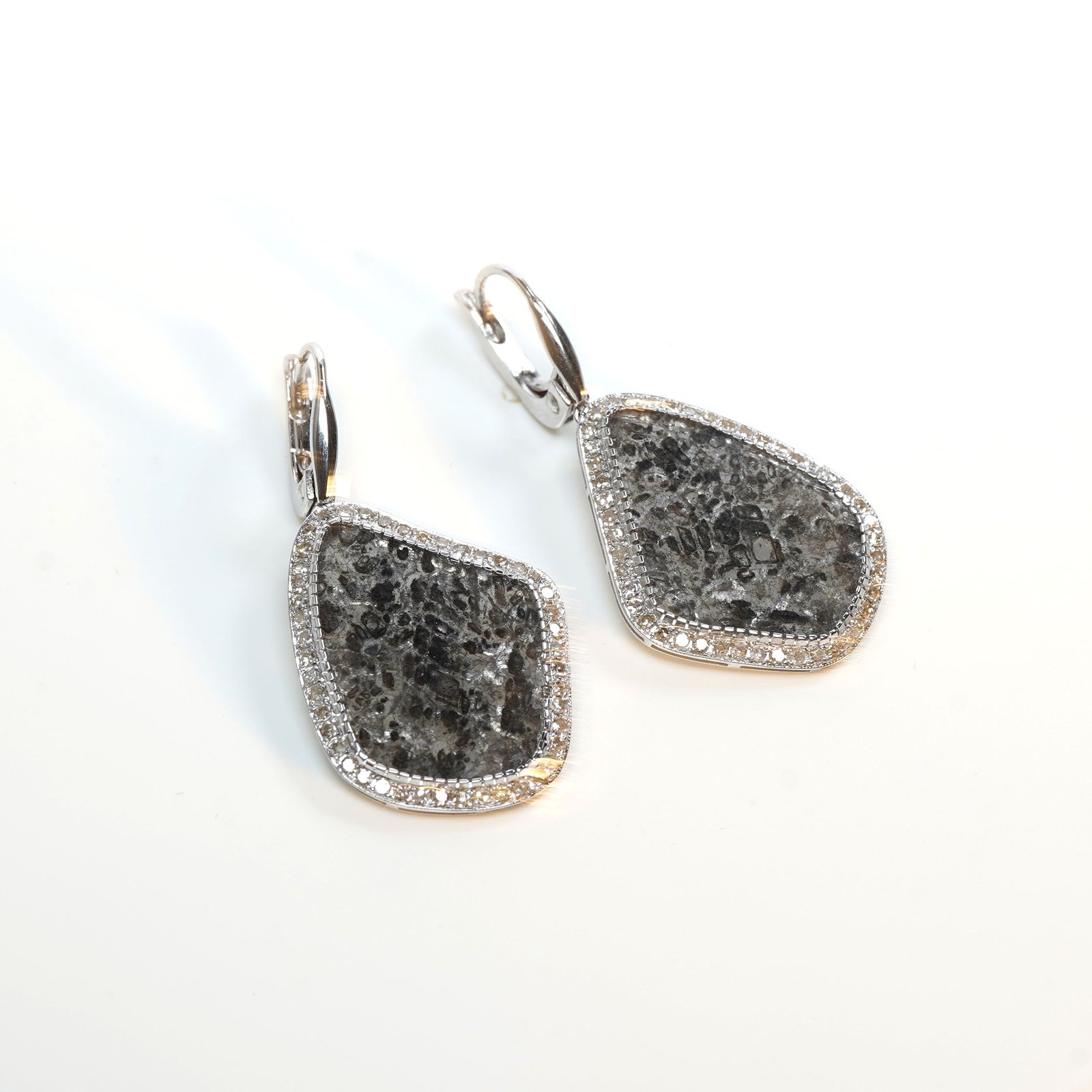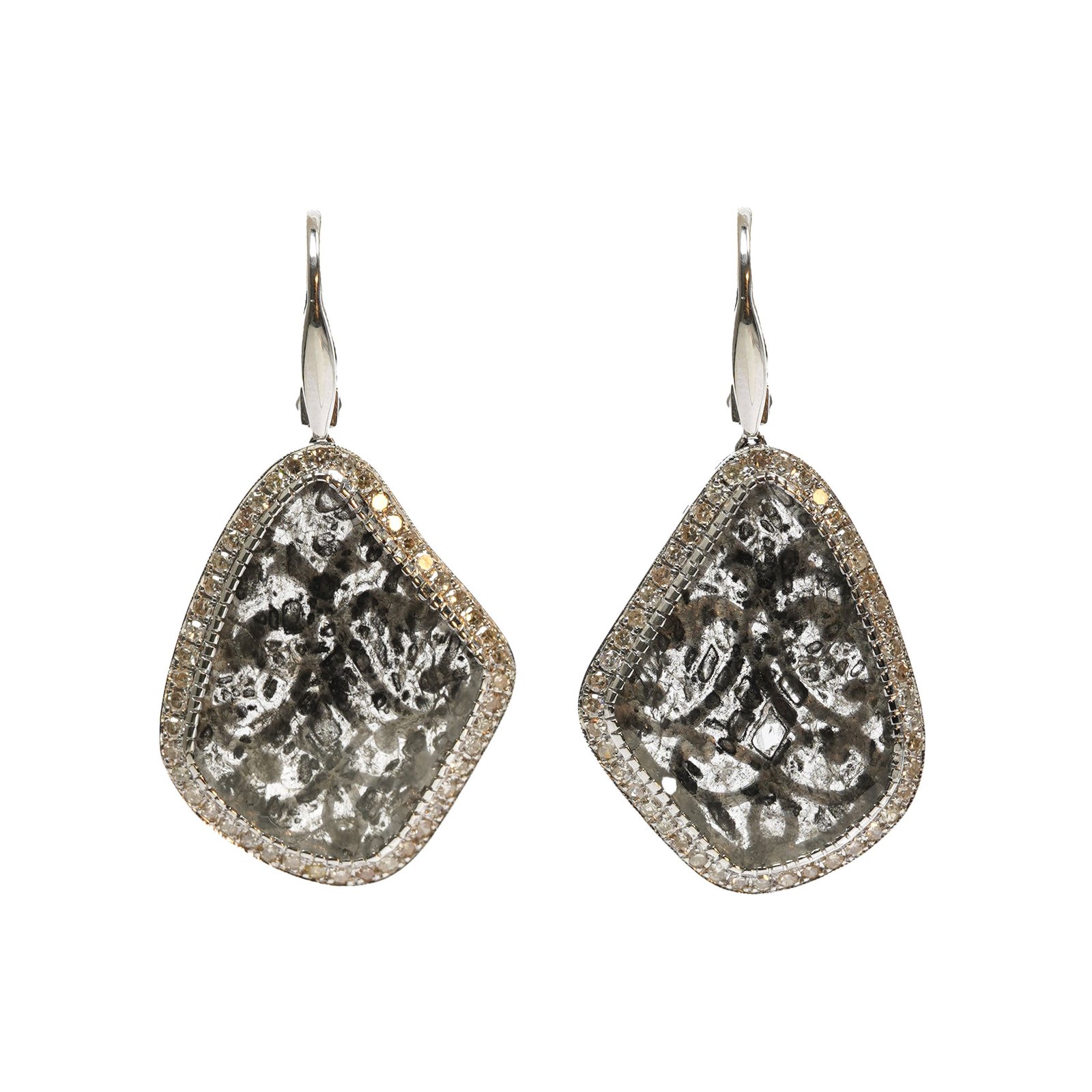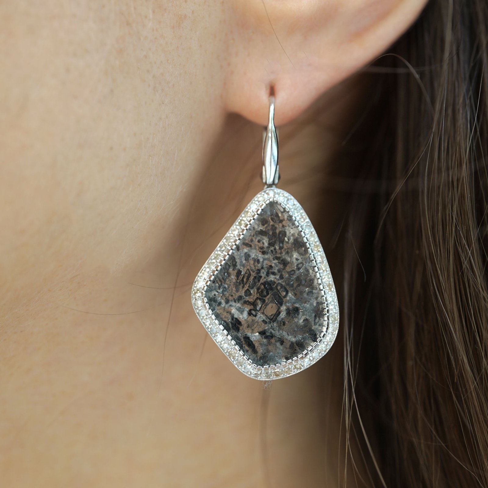 Each earring holds a natural slice diamond, where dark mineral patterns formed deep inside the planet millions of years ago. They look like tiny rock landscapes — cracked stone, mountain shadows, traces of pressure and heat that shaped them long before us.