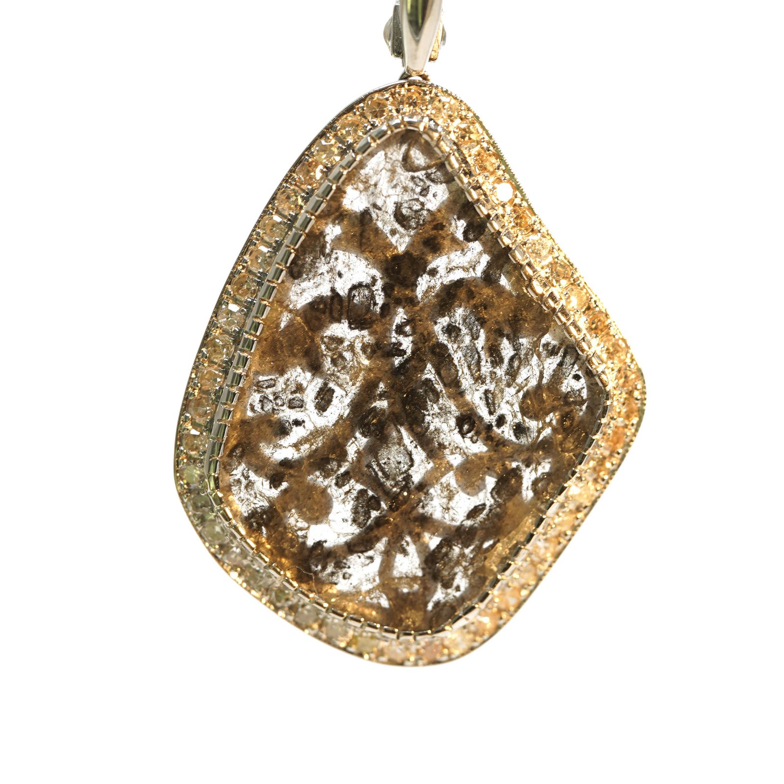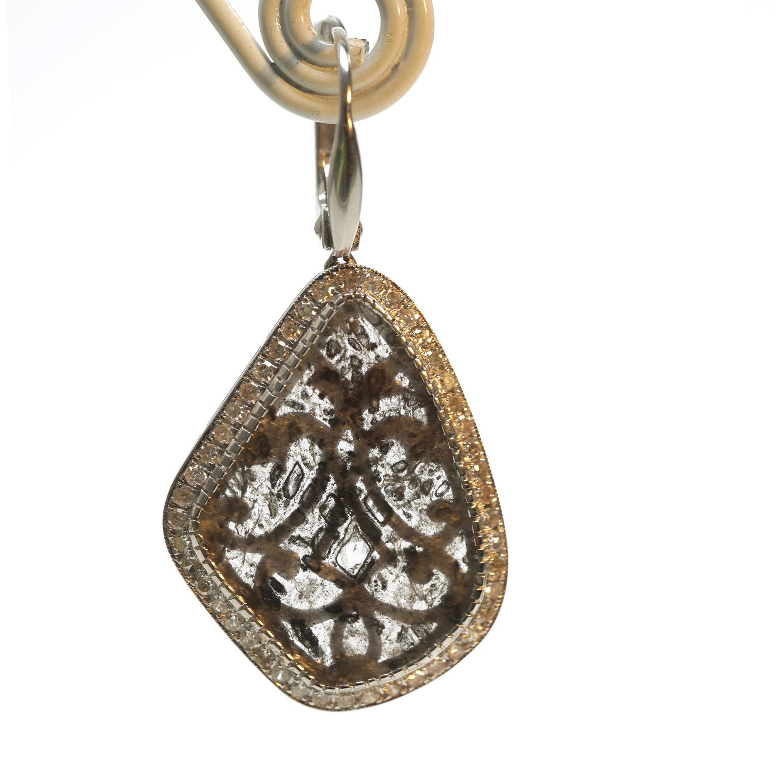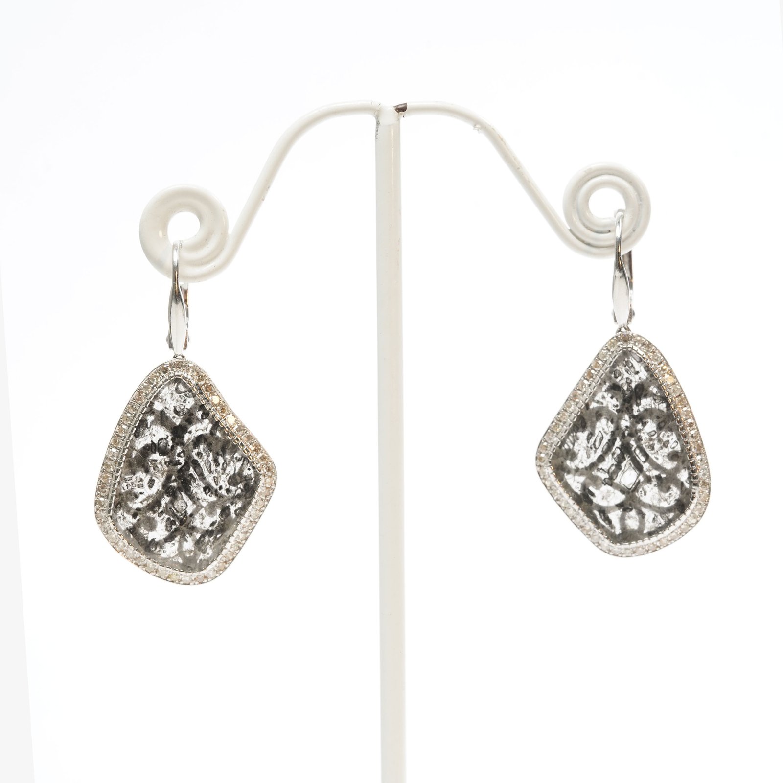 Each earring holds a natural slice diamond, where dark mineral patterns formed deep inside the planet millions of years ago. They look like tiny rock landscapes — cracked stone, mountain shadows, traces of pressure and heat that shaped them long before us.