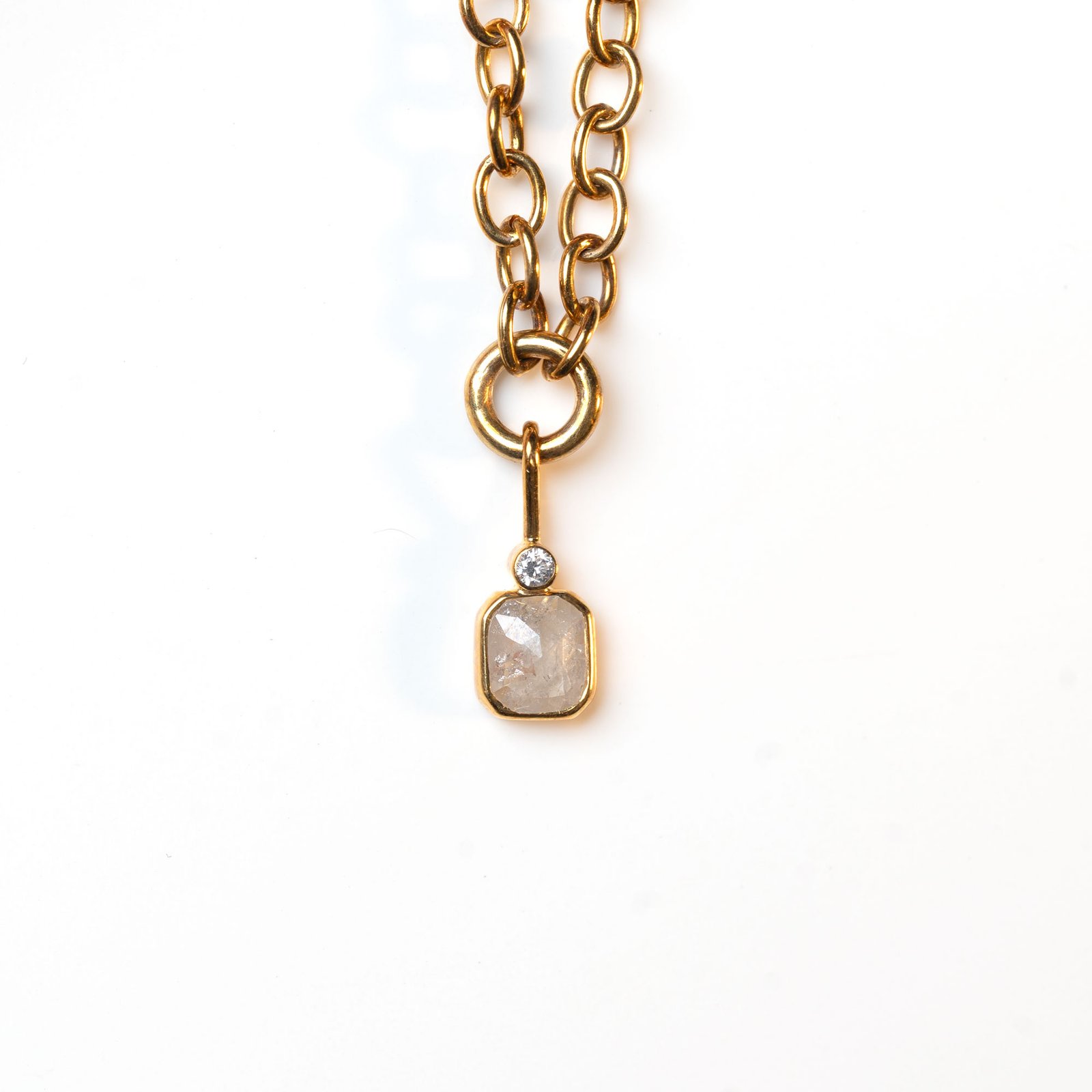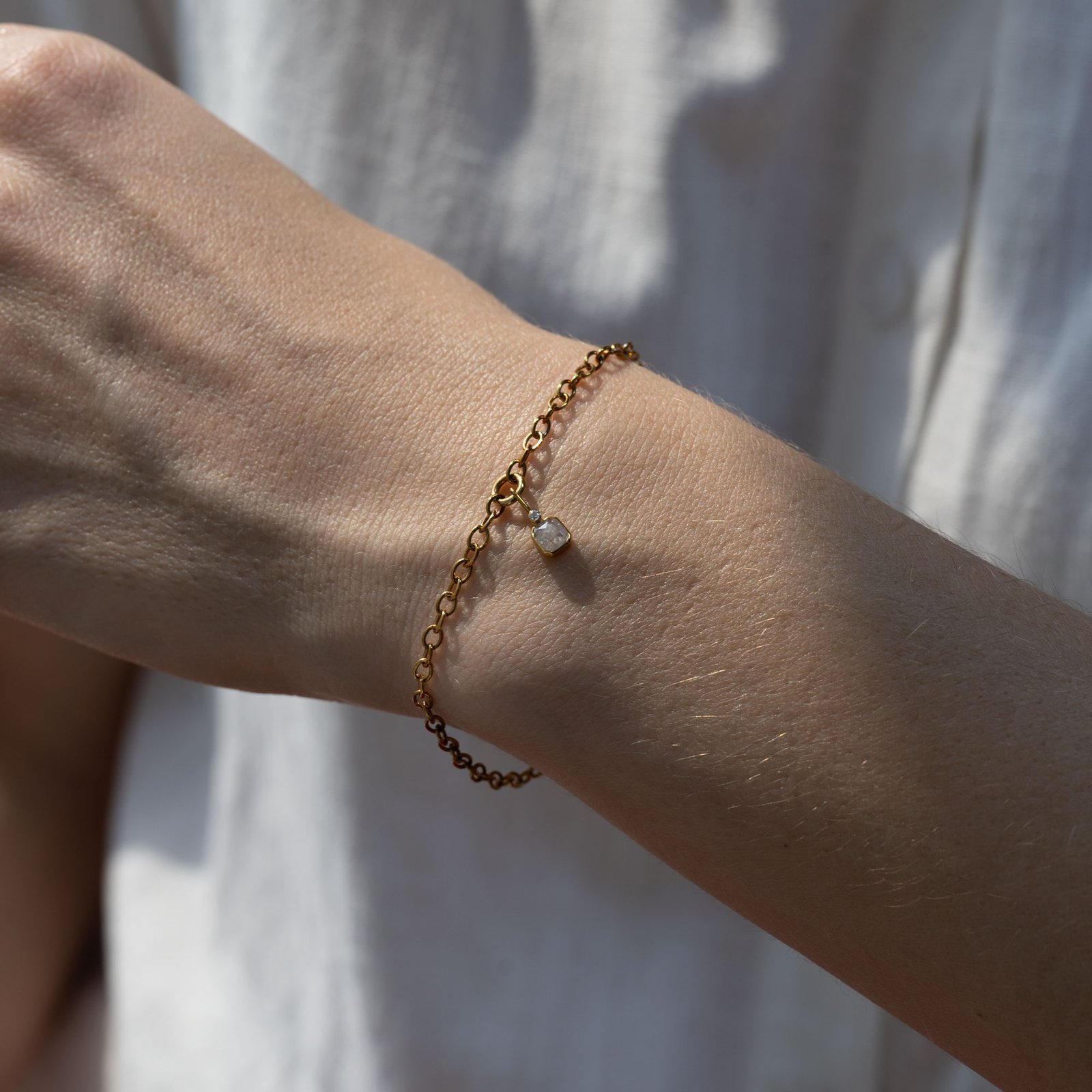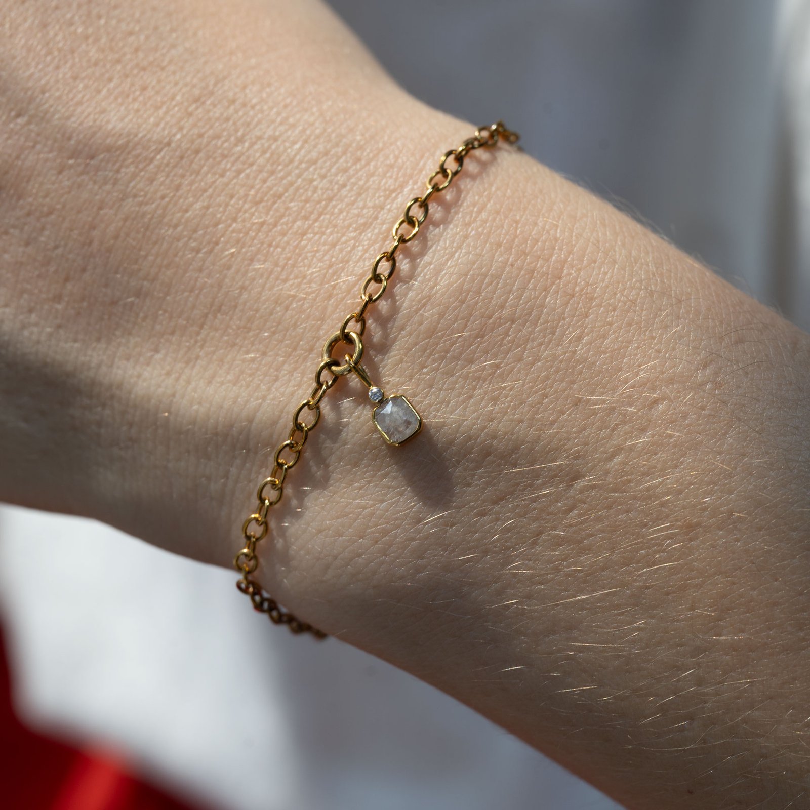 A small point of light, easy to miss, yet always present. It appears for a moment as the diamond catches the light, then softens again. There is no need for more — just a quiet reflection, held close to the skin. Nothing constant, nothing fixed. Glint is about that brief, subtle light that stays with you, even when it fades.