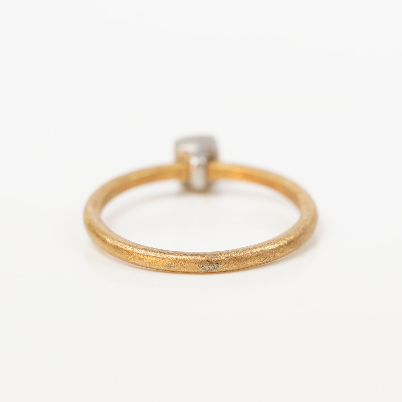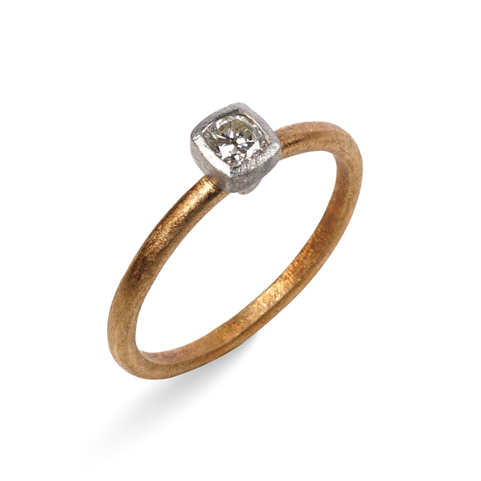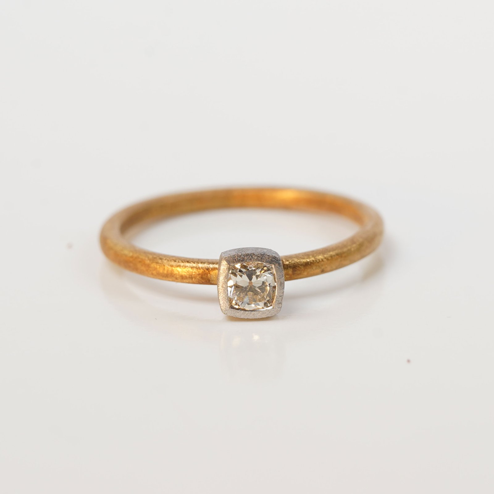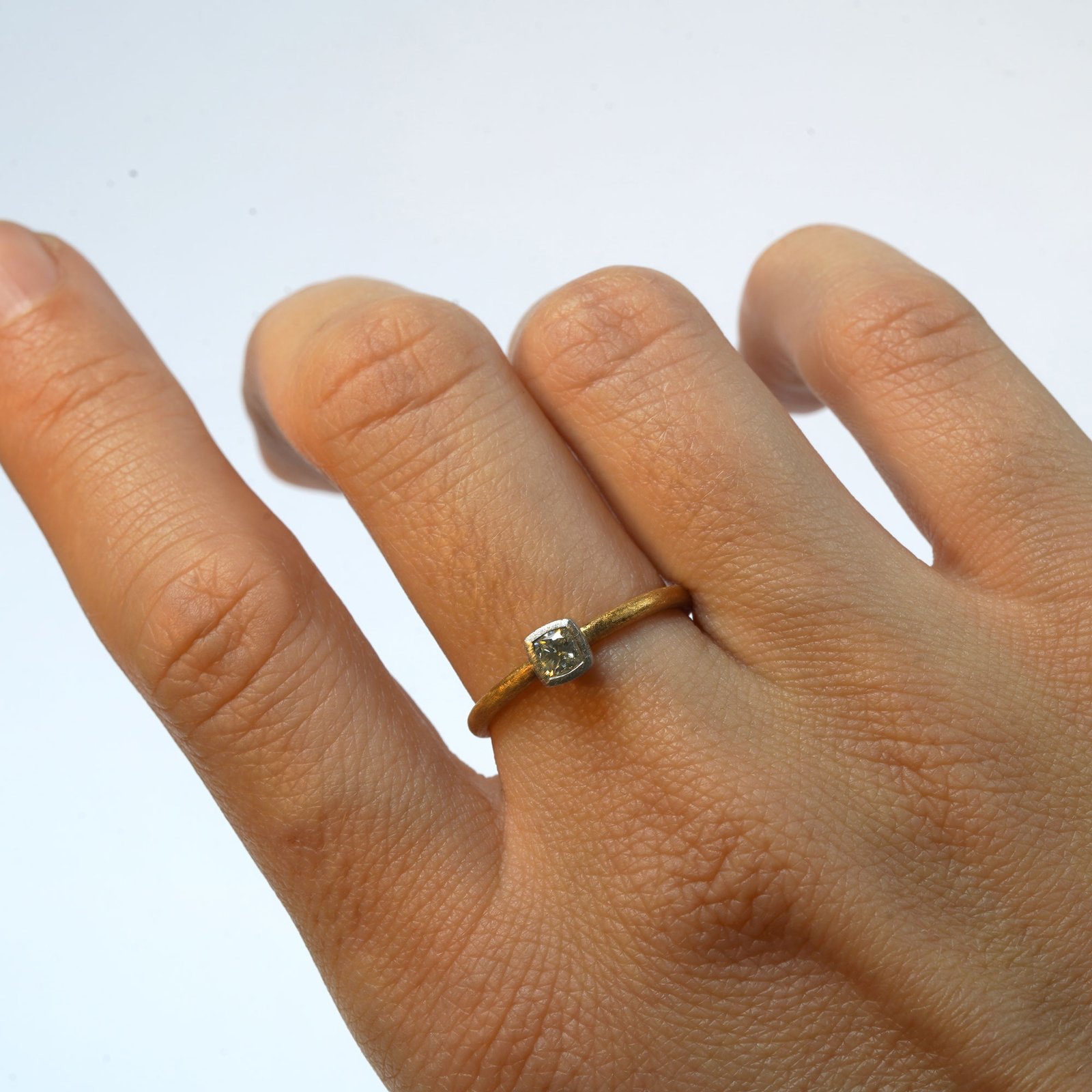 The square Old Cut diamond, set in platinum, carries a bright memory of the past — light shaped slowly, carefully, and left unchanged. Its reflection feels softer, as if time itself has learned to pause. The yellow gold band is the present. Warm, familiar, and continuous, it moves forward with every day. Together, past and present meet in balance, not competing, but existing side by side. Time Kept is about keeping what matters close, and letting time live gently within it.